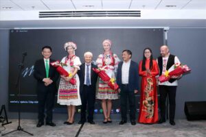 Ông Hồ Huy, Tổng Lãnh sự Danh dự Cộng hòa Slovakia tại Thành phố Hồ Chí Minh (bìa trái) cùng tặng hoa chúc mừng 3 tác giả dự án “Party trong thế kỷ 21” tại sự kiện “Ngày văn hóa Slovakia” tại Thành phố Hồ Chí Minh. Ảnh: TTXVN