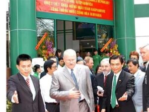 Tổng thống Ivan Gasparovic (giữa) và ông Hồ Huy (bìa phải), lãnh sự danh dự Slovakia tại TP.HCM, khai trương Văn phòng lãnh sự quán danh dự Slovakia tại số 64-68 Hai Bà Trưng, Q.1, sáng 18/10/2006 – Ảnh: T.T.D.